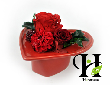 カラー:レッド サイズ:L12cm W11.5cm H4.5cm 花材:バラ2種、ミニダリア、アジサイ、ピトスポラム、ベリー ベース:2wayハート型(赤) Price:4180yen